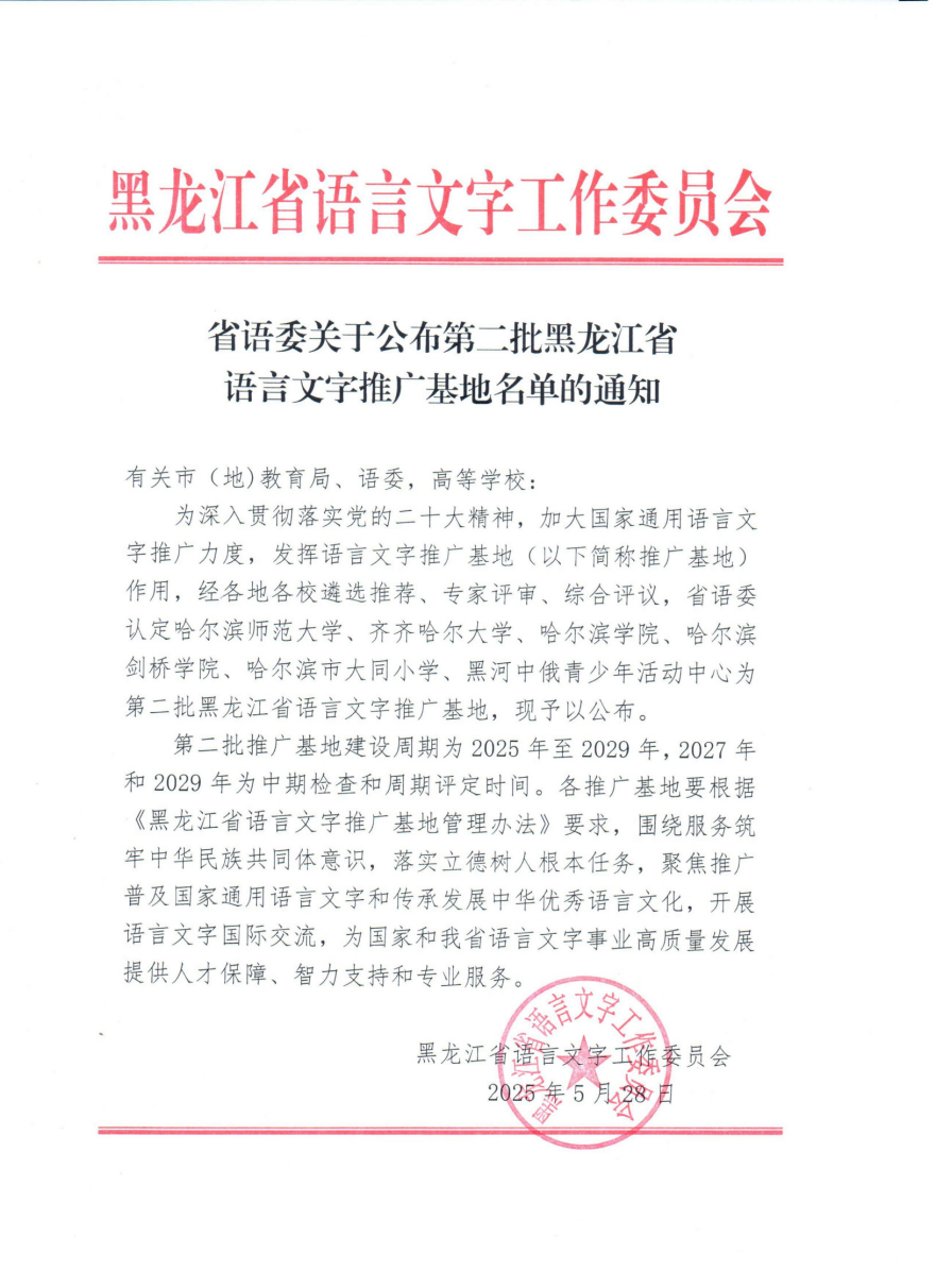 近期,黑龍江省語言文字工作委員會發(fā)布了《省語委關(guān)于公布第二批黑龍江省語言文字推廣基地名單的通知》,我校被省語委認(rèn)定為黑龍江省第二批語言文字推廣基地。此次省級基地的獲批,是我校在基地建設(shè)方面取得的又一重要成果。