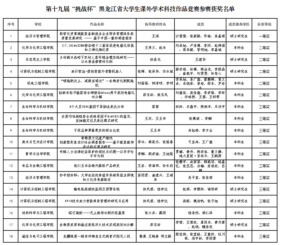 近日,由團(tuán)省委、省科學(xué)技術(shù)協(xié)會(huì)、省教育廳、省科技廳、省社會(huì)科學(xué)院、省學(xué)生聯(lián)合會(huì)主辦,東北石油大學(xué)承辦的第十九屆工銀融e行 “挑戰(zhàn)杯”黑龍江省大學(xué)生課外學(xué)術(shù)科技作品競(jìng)賽評(píng)審結(jié)果公示發(fā)布。我校代表隊(duì)斬獲一等獎(jiǎng)1項(xiàng)、二等獎(jiǎng)5項(xiàng)、三等獎(jiǎng)12項(xiàng)。